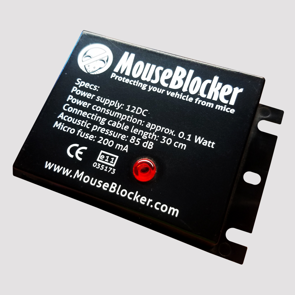 The Mouse Blocker Classic is a 12V powered device designed to protect vehicles from the costly damage caused by mice. The Mouse Blocker Classic emits a powerful ultrasonic sound (similar to a jack hammer) making the area uncomfortable for mice to nest. The unit runs off the vehicles battery and only draws less than 1 watt of power – similar to that of an LCD clock.