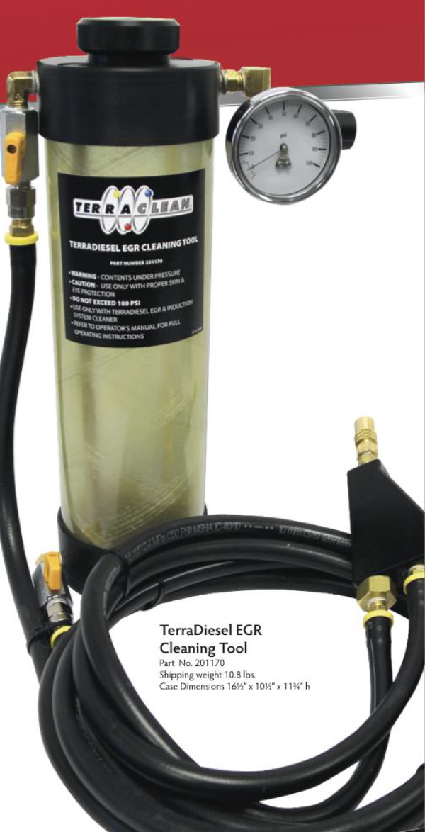 The TerraDiesel EGR Cleaning Tool applies a powerful cleaner, TerraDiesel EGR and Induction System Cleaner, into the circuit. For most applications the exhaust side is serviced, then the intake side. This cleaner rapidly dissolves the deposits, eliminating the issues commonly associated with plugged EGRs.